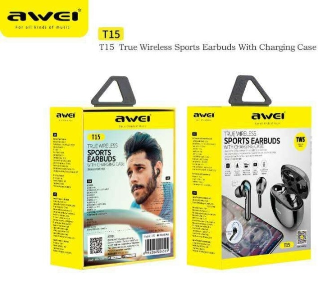 Επαναφορτιζόμενα, ασύρματα ακουστικά σπορ σε θήκη φόρτισης Bluetooth TWS T15 AWEI AWEI