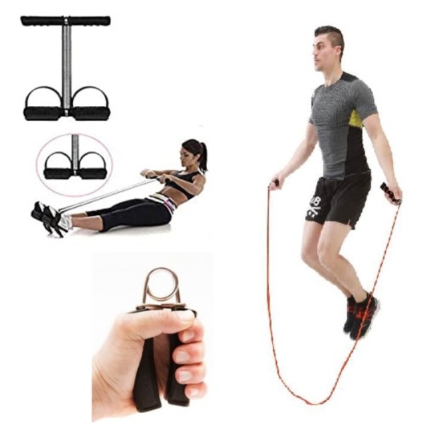Το σετ περιλαμβάνει : ελατήριο καρπού χεριού, σχοινάκι γυμναστικής και πτυσσόμενο όργανο γυμναστικής για κοιλιακούς.