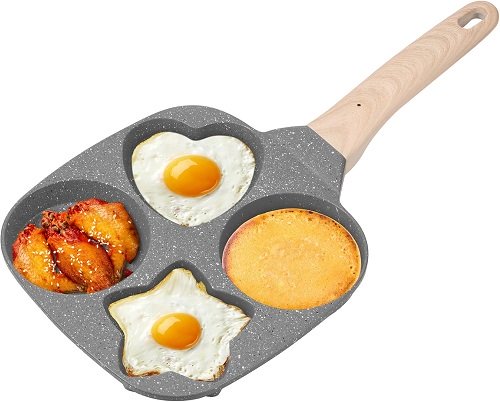 Το τηγάνι διαθέτει δύο στρογγυλές θέσεις, μία σε σχήμα καρδιάς και μία σε σχήμα αστεριού, ιδανικές για αυγά, pancakes, burgers ή δημιουργικά παιδικά γεύματα που εντυπωσιάζουν.
